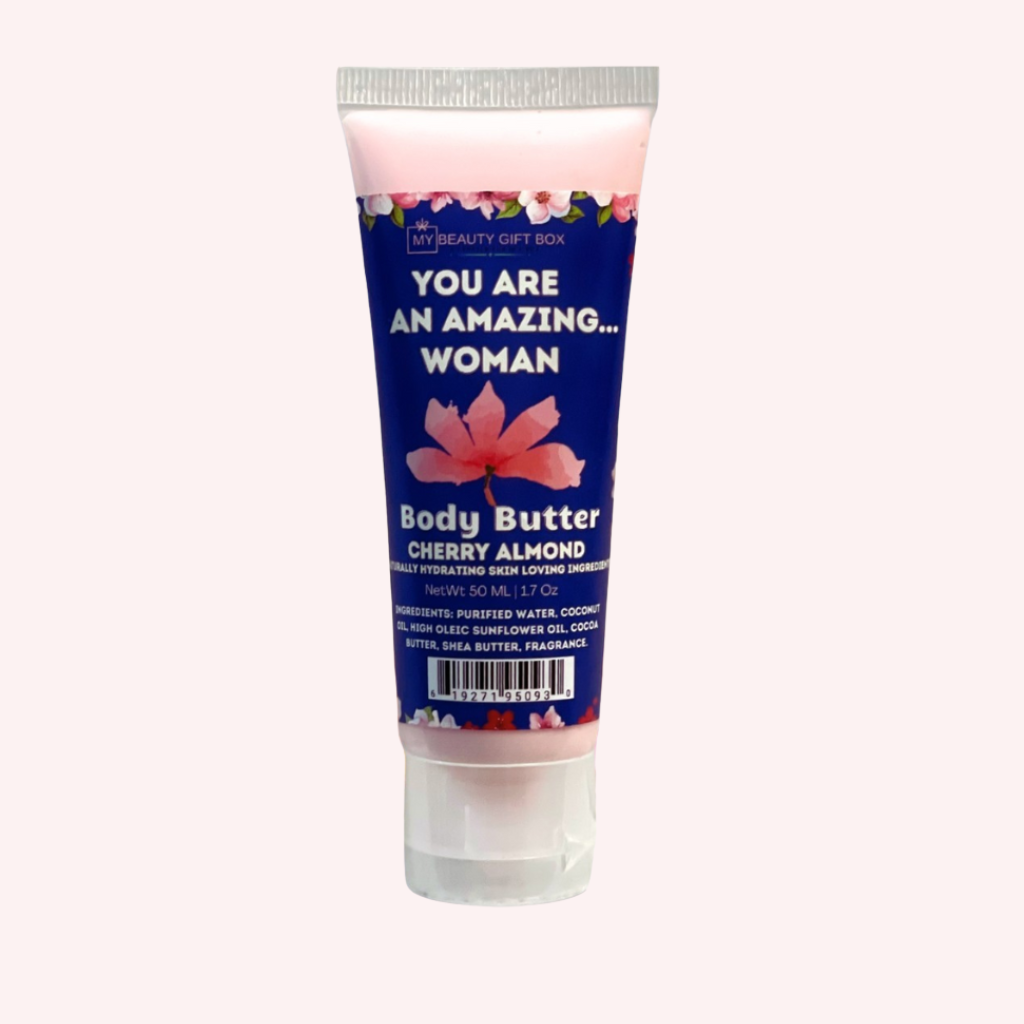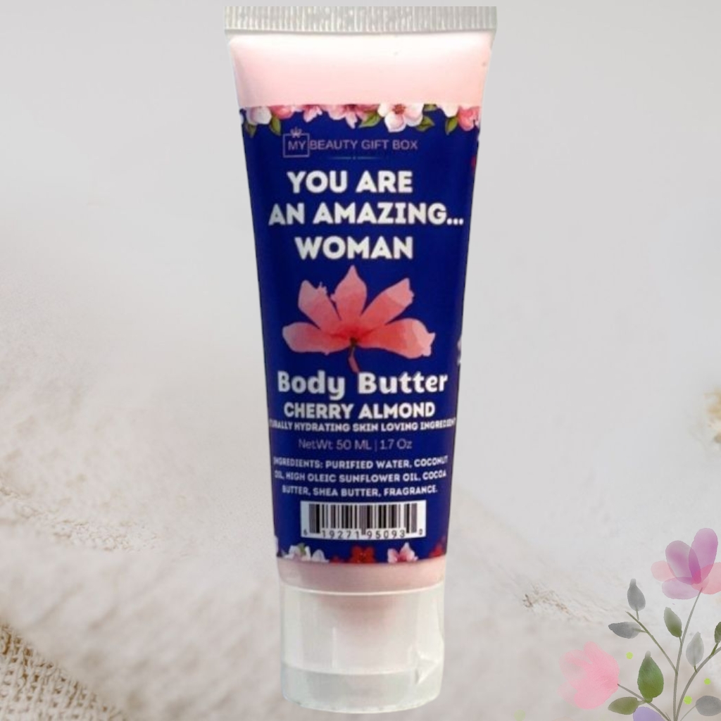 “Treat your skin with the rich, velvety Cherry Almond Body Butter from the My Beauty Gift Box collection. This 1.7 oz body butter delivers intense hydration while enveloping your senses in a delightful blend of cherry sweetness and almond warmth. A perfect touch of luxury for daily self-care or gifting.”