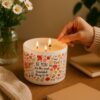 A candle from our Inspiration & Blooms Collection displaying a double-sided design of vibrant hand illustrated florals on frosted glass with an inspirational sentiment that reads “Be You – It’s The Most Beautiful Thing To Do.” Inspirational candle features soy-based wax and 3 fabric wicks with 30 hours of burn time activating a relaxing Vanilla scent.