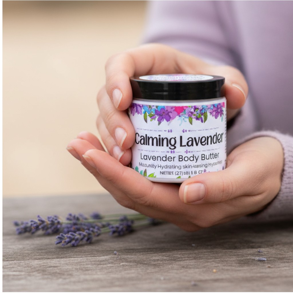 Experience the soothing embrace of our Calming Lavender Body Butter. Crafted with nourishing ingredients and infused with the serene scent of lavender, this 6 oz blend deeply hydrates your skin while promoting relaxation. Perfect for moments of self-care or as a thoughtful gift.