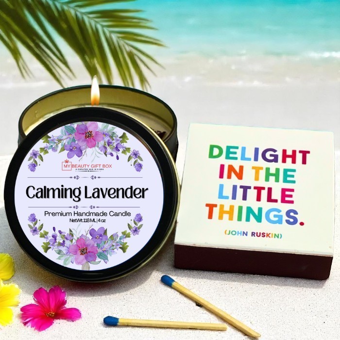 Unwind with the Calming Lavender set by Beauty Gift Box Candle. This handmade 4 oz candle fills your room with a soothing lavender scent, creating a spa-like atmosphere. The soft, purple wax and gentle flame provide instant stress relief, making it perfect for meditation, relaxation, or unwinding after a long day. This candle is self-care in a box.