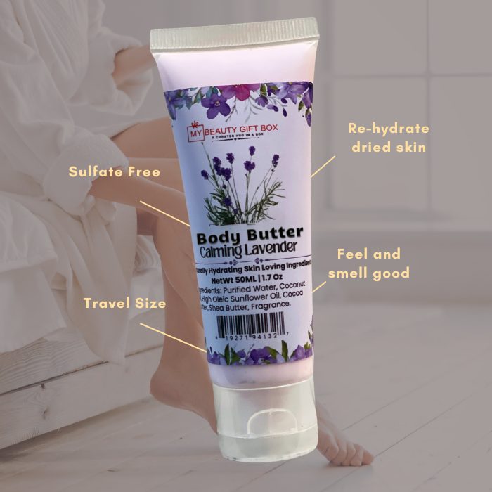 Experience the soothing embrace of our Calming Lavender Body Butter. Crafted with nourishing ingredients and infused with the serene scent of lavender, this 1.7 oz blend deeply hydrates your skin while promoting relaxation. Perfect for moments of self-care or as a thoughtful gift.