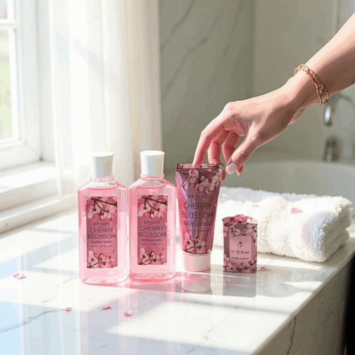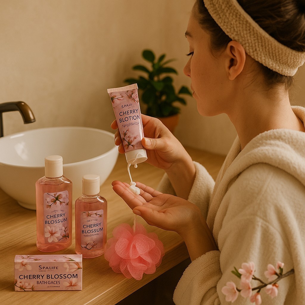 • Body Lotion (1.7 Fl oz)– After your shower, apply our Cherry Blossoms Body Lotion to keep your skin moisturized and refreshed, embracing the delightful scent of cherry blossoms.