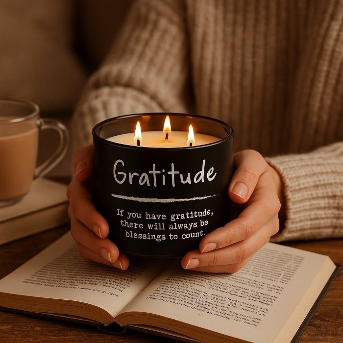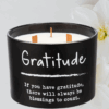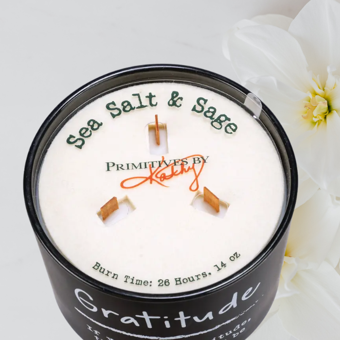 A matte black glass vessel holds this soy-based wax candle featuring a refreshing sea salt and sage scent with “Gratitude If You Have Gratitude, There Will Always Be Blessings To Count.” sentiment. This 14 oz. candle makes a perfect gift. Our Gratitude jar candle contains three wooden wicks for a total of 26 hours of burn time. Includes a plastic wax cover for protection and a polished look.