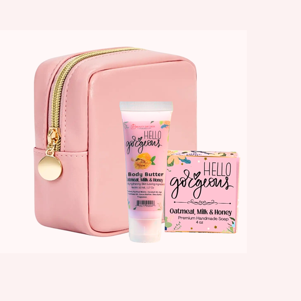 The Hello Gorgeous Leather Cosmetic Pouch 3 PCS Gift Set is ideal for any occasion, whether it’s a birthday, Christmas, a thank you gesture, or an anniversary. The Cosmetic pouch is accented with a stylish gold zipper, adding a touch of elegance to its design. This set includes our signature Oatmeal Milk & Honey scented body butter and soap set.