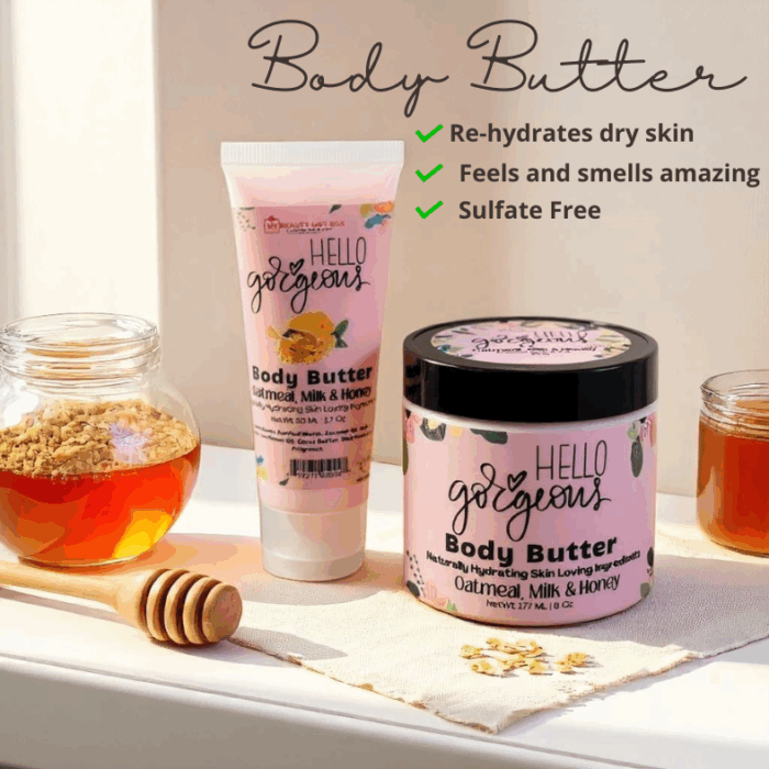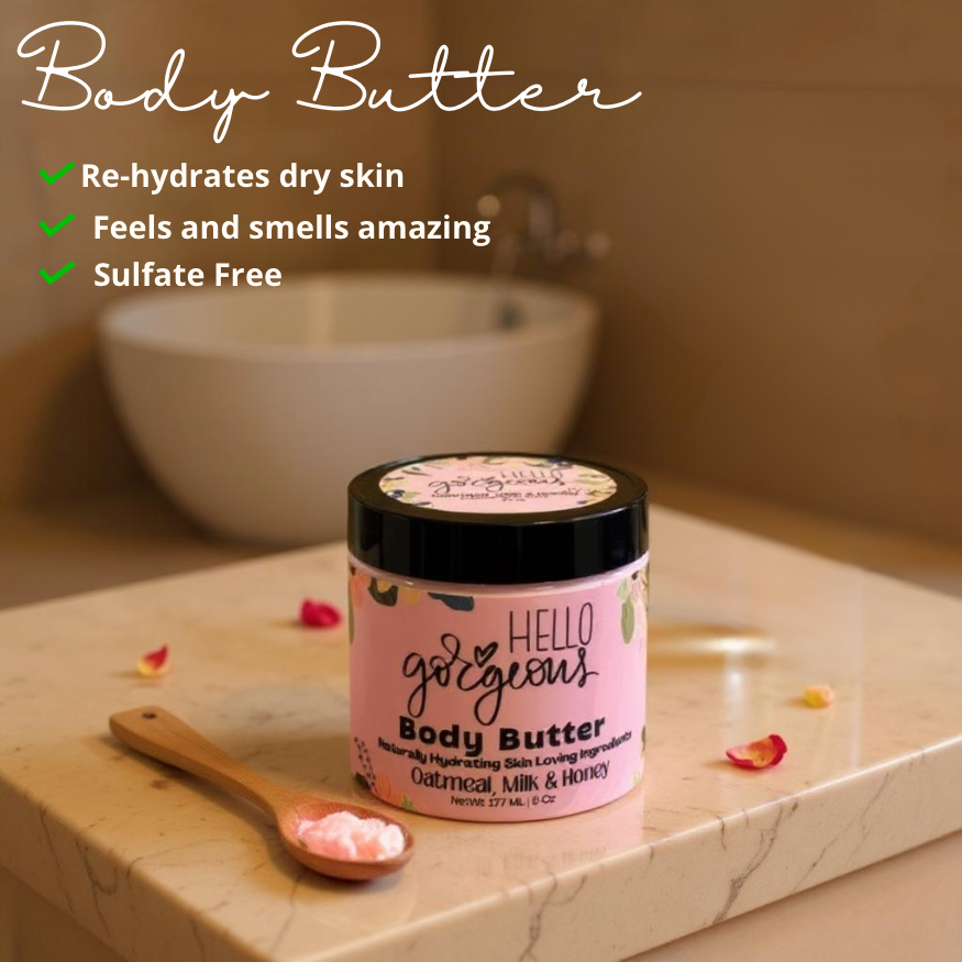 Discover the ultimate skincare solution with our Hello Gorgeous Oatmeal, Milk & Honey Body Butter. This luxurious body butter nourishes and hydrates dry skin with its blend of oatmeal, milk, and honey. The comforting scent and cloud-like texture will leave your skin feeling soft, smooth, and deeply moisturized. Say goodbye to dry skin woes and hello to healthy, glowing skin.