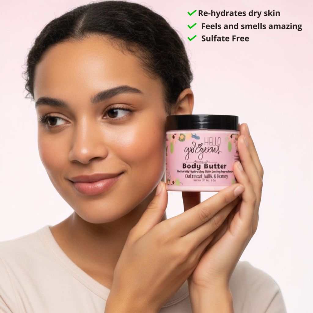 The Hello Gorgeous collection is all about nurturing a mindset of self-acceptance and confidence. This luxurious body butter nourishes and hydrates dry skin with its blend of oatmeal, milk, and honey. The comforting scent and cloud-like texture will leave your skin feeling soft, smooth, and deeply moisturized. Say goodbye to dry skin woes and hello to healthy, glowing skin.