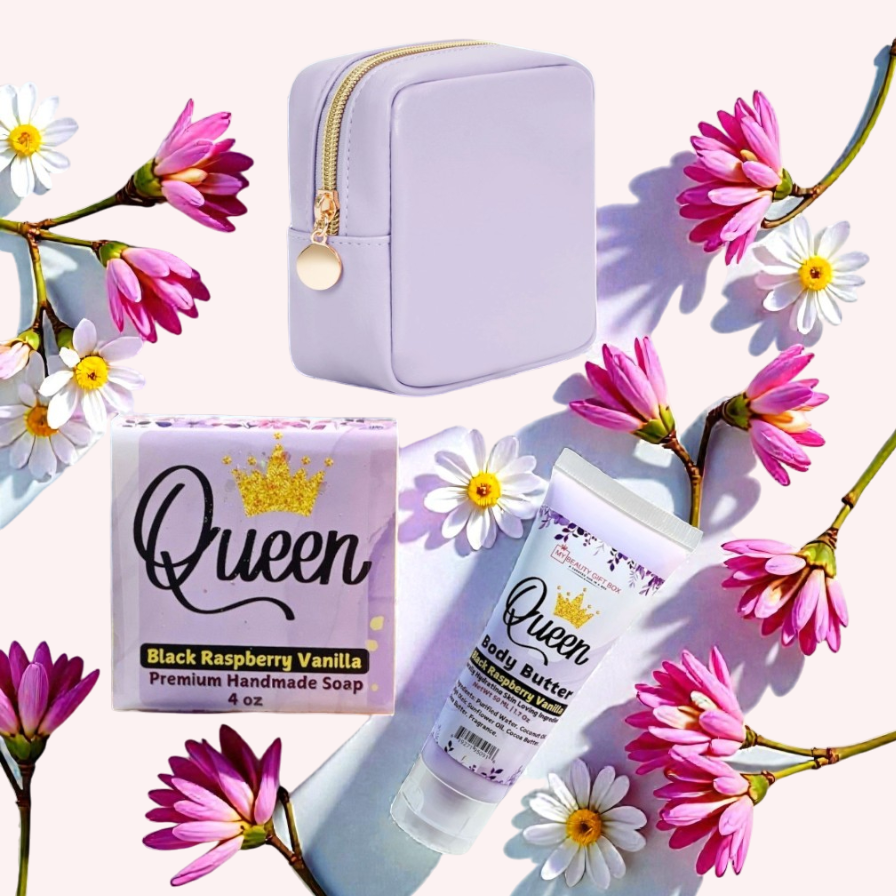 The Queen Leather Cosmetic Pouch 3 PCS Gift Set is ideal for any occasion, whether it’s a birthday, Christmas, a thank you gesture, or an anniversary. The Cosmetic pouch is accented with a stylish gold zipper, adding a touch of elegance to its design. This set includes our signature Black Raspberry Vanilla scented body butter and soap set.