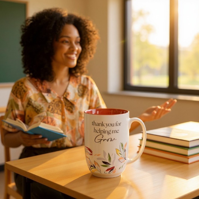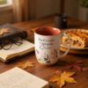 Autumnal leaf design, White mug, Gray screen-printed text, Thank you for helping me grow, Glazed rust-brown interior, Ceramic mug, Exposed clay base, Not microwave and dishwasher-safe, Hand-wash recommended, Packaged in a tuck-top Kraft cardboard box, Packaging dimensions: 5″ x 4.8″ x 3.6″ (127 x 122 x 91mm), Capacity: 15 fl. oz. (444 ml)